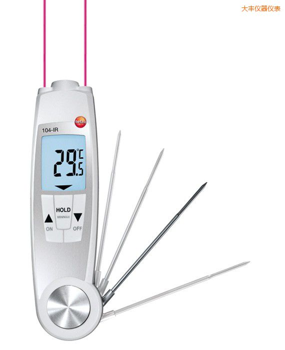 紅外及接觸式測溫二合一testo 104-IR配備精確的2點(diǎn)瞄準(zhǔn)激光,光學(xué)分辨率10:1,,測量范圍清晰可見,可隨時(shí)進(jìn)行快速并精確的表面溫度測量。二合一溫度測量儀特別適用于食品進(jìn)貨檢測以及快速檢測單個(gè)或整箱食品的表面溫度。 刺入式溫度探頭適用于測量如肉類和香腸等食品的核心中心溫度。通常,在紅外表面溫度測量不足以判定食品安全的情況下使用。刺入式探頭在不使用時(shí)可通過折疊方式收入儀器中,以防折斷損壞。